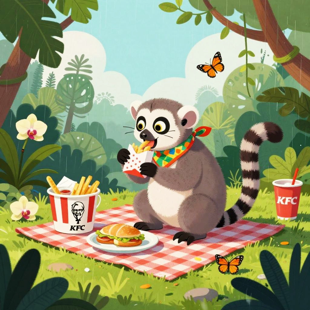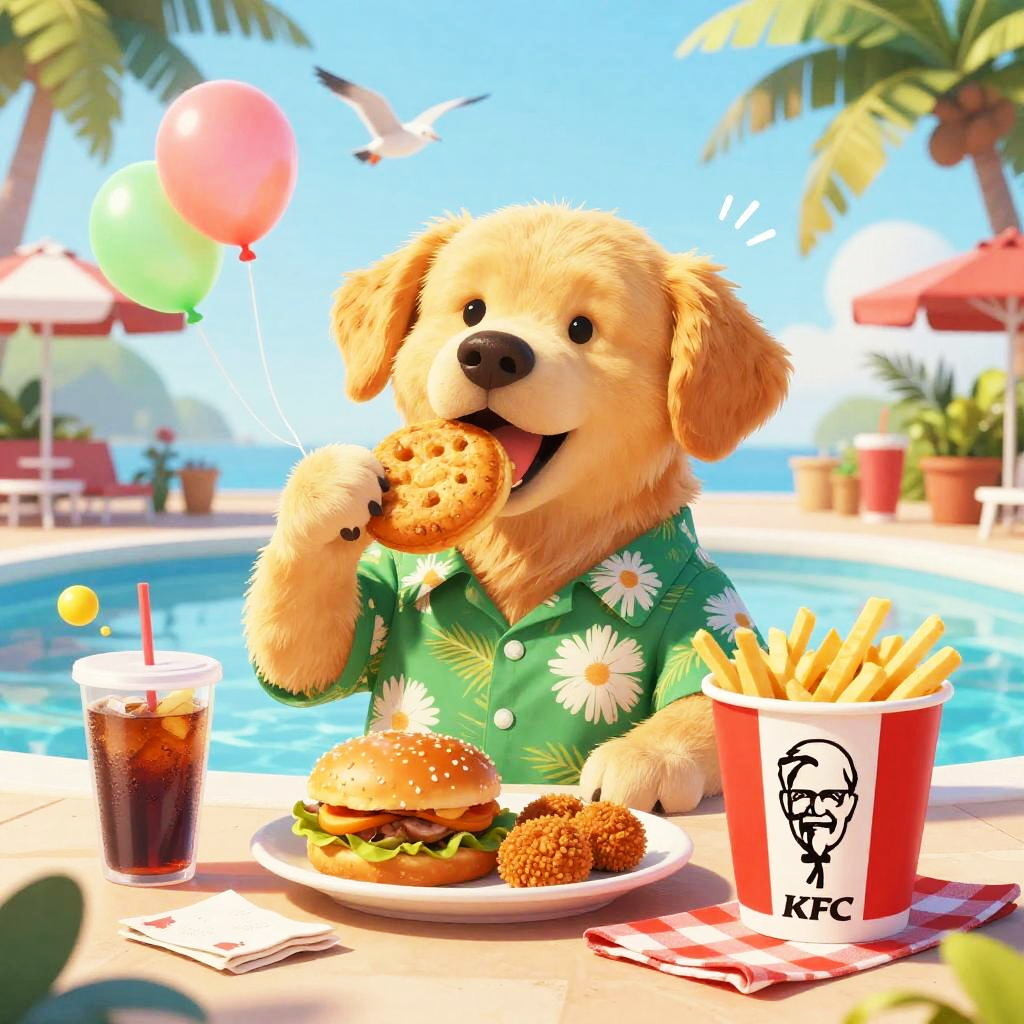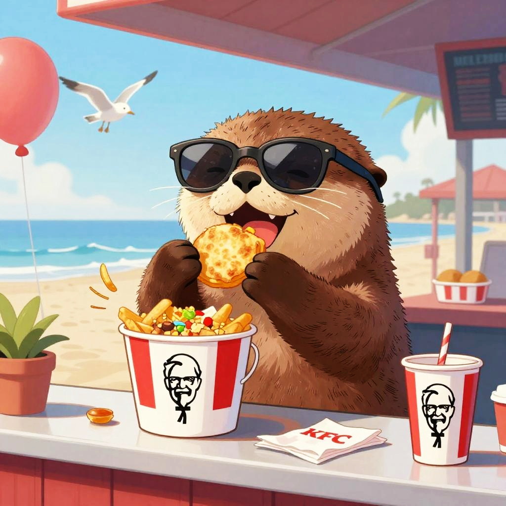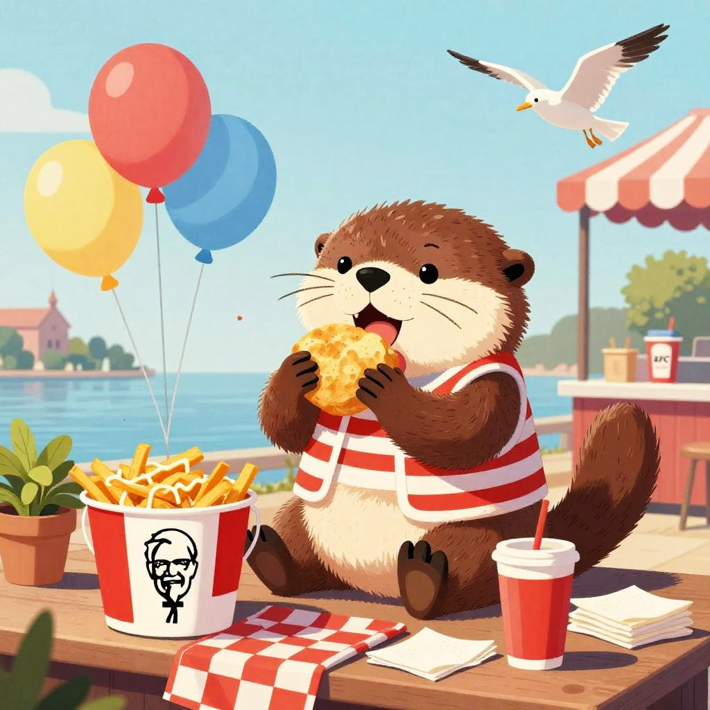 A colorful digital illustration of a cute, anthropomorphic beaver wearing blue denim overalls, sitting on a wooden bench by a river. The beaver is eating a sandwich, with a bucket of KFC fries and a drink with a red straw on the bench. A red-checkered cloth is draped over the bench's right side. Two red balloons float in the background. The beaver's fur is brown and textured, and the overall scene has a whimsical, playful style. The riverbank is grassy, and trees are visible in the distance.