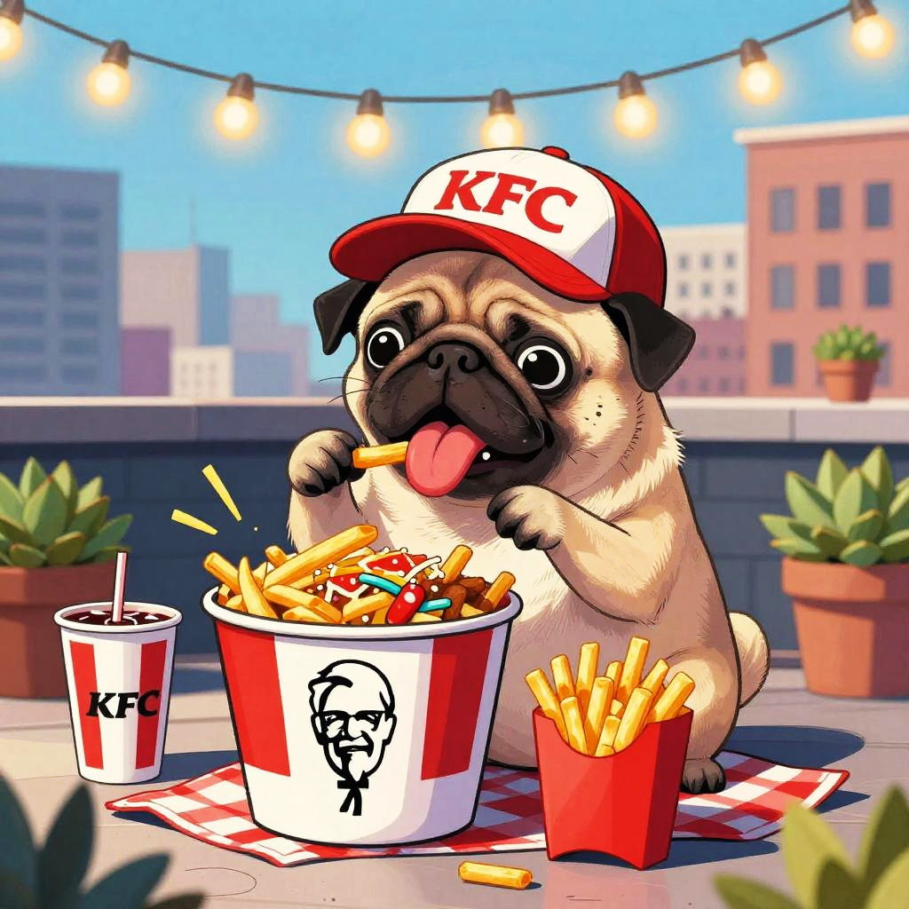 Determined beaver wearing carpenter overalls devouring a KFC meal at riverside wood workshop bench, rendered in realistic charcoal and pencil shading; exaggerated expressions and lively motion lines, whimsical atmosphere, saturated colors, cheerful humor, clean background and crisp vectors, soft grain and subtle rim light, storytelling props like bucket, napkins, soda cup, and a checkered cloth, environmental details such as balloons, dynamic composition, radiant light and friendly vibe