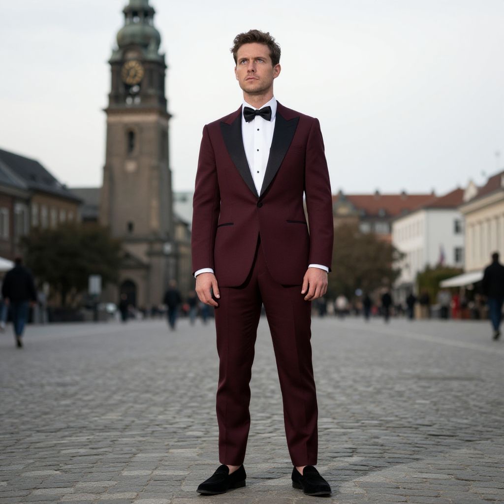 A man, burgundy tuxedo, satin lapels, white dress shirt, black silk bow tie, black suede loafers, historic clock tower, cobblestone square, Holga camera style, contemplative expression Man has masculine face and piercing eyes