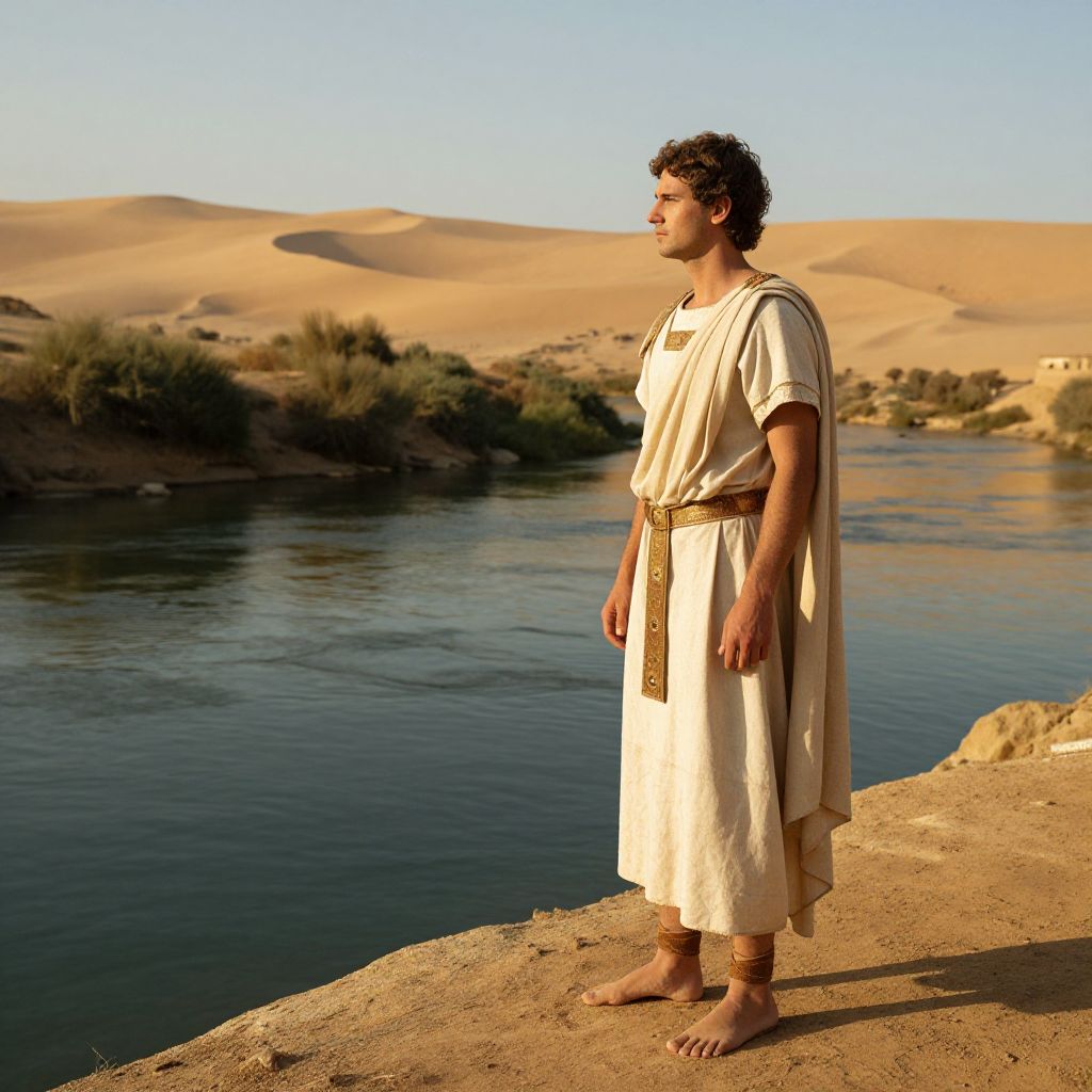 Photograph of a young Black man with curly hair, wearing a beige ancient-style tunic and sandals, standing by a river with sandy desert hills in