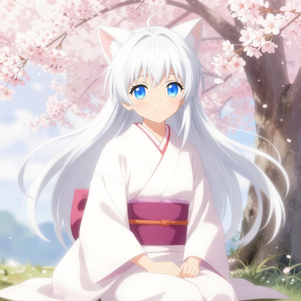Anime white cat girl with flowing silver hair, large expressive blue eyes, wearing a delicate kimono, sitting gracefully under cherry blossom trees, soft pastel colors, detailed background