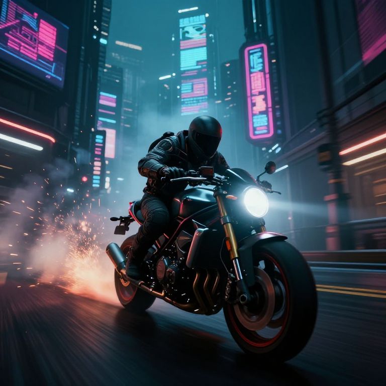 Stunt motorcyclist in silhouette performs aerial jump over New York City skyline at sunset, with vibrant orange and purple sky.