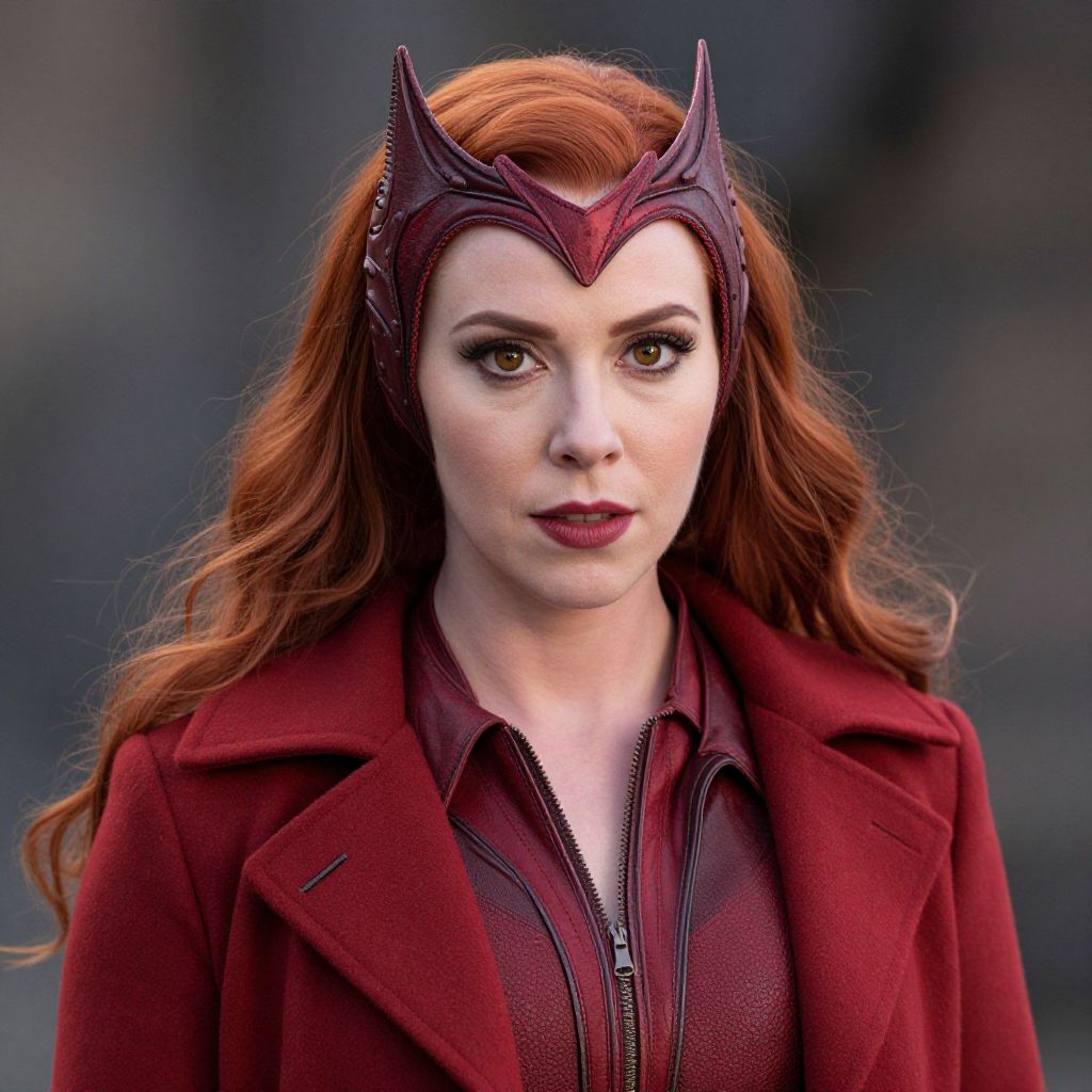 Scarlet Witch Costume Strange, a close up of a woman with red hair wearing a red coat