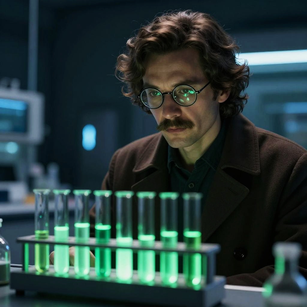 This is a digital illustration of an older man with gray hair and a mustache, wearing steampunk-style goggles with multiple lenses. He's dressed in a beige coat over a dark shirt. The background is dark with blurred, colorful lights, creating a moody, sci-fi atmosphere. The man's serious expression and the detailed textures on his goggles add a sense of depth and character.