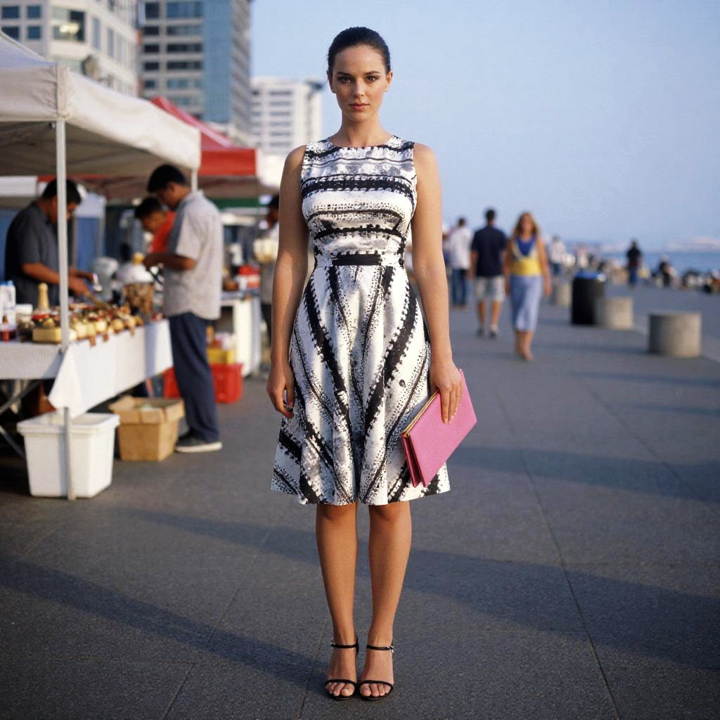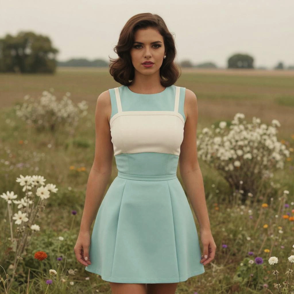 A Hourglass woman in a Cibachrome style, wearing a black embellished sweater with silver sequins and a bright turquoise skater skirt, stands on a riverboat on the Zambezi River near Victoria Falls, holding a black chain-link crossbody bag. Sexy. Pretty face and beаutiful eyes. Big breasts