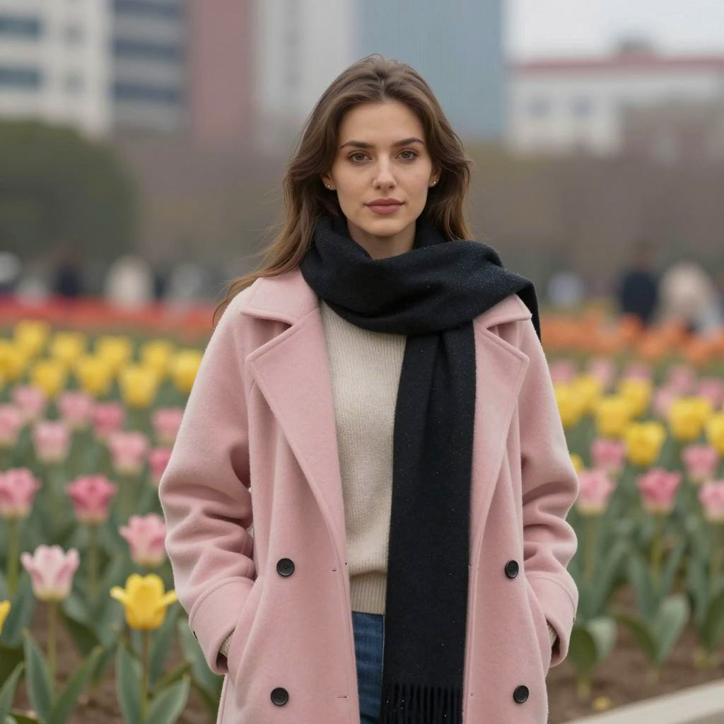 Woman winter outfit, photograph of young woman, long brown hair, light skin, standing in garden, wearing light beige sweater, pink ured coat, black scarf, pink and yellow flowers in background, blurred city buildings in background, soft natural light, bokeh effect, casual style, hands in coat pockets, confident expression, springtime atmosphere