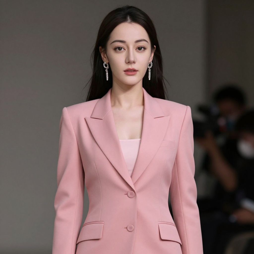 Portrait of an elegant Asian woman with long black hair wearing a pink blazer suit and matching top. She is accessorized with sparkling dangling earrings and looking directly at the camera. The background is blurred with indistinct figures, highlighting the formal and sophisticated style of the subject.