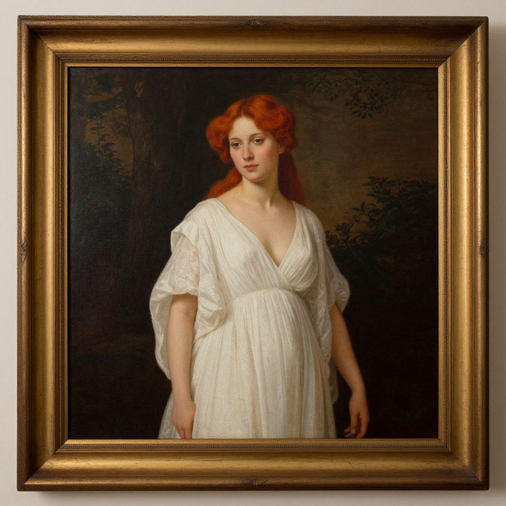 Framed canvas art depicting a classical-style portrait of a woman with vibrant red hair, wearing a flowing white dress, set against a dark, forested background, showcasing intricate details and warm tones.