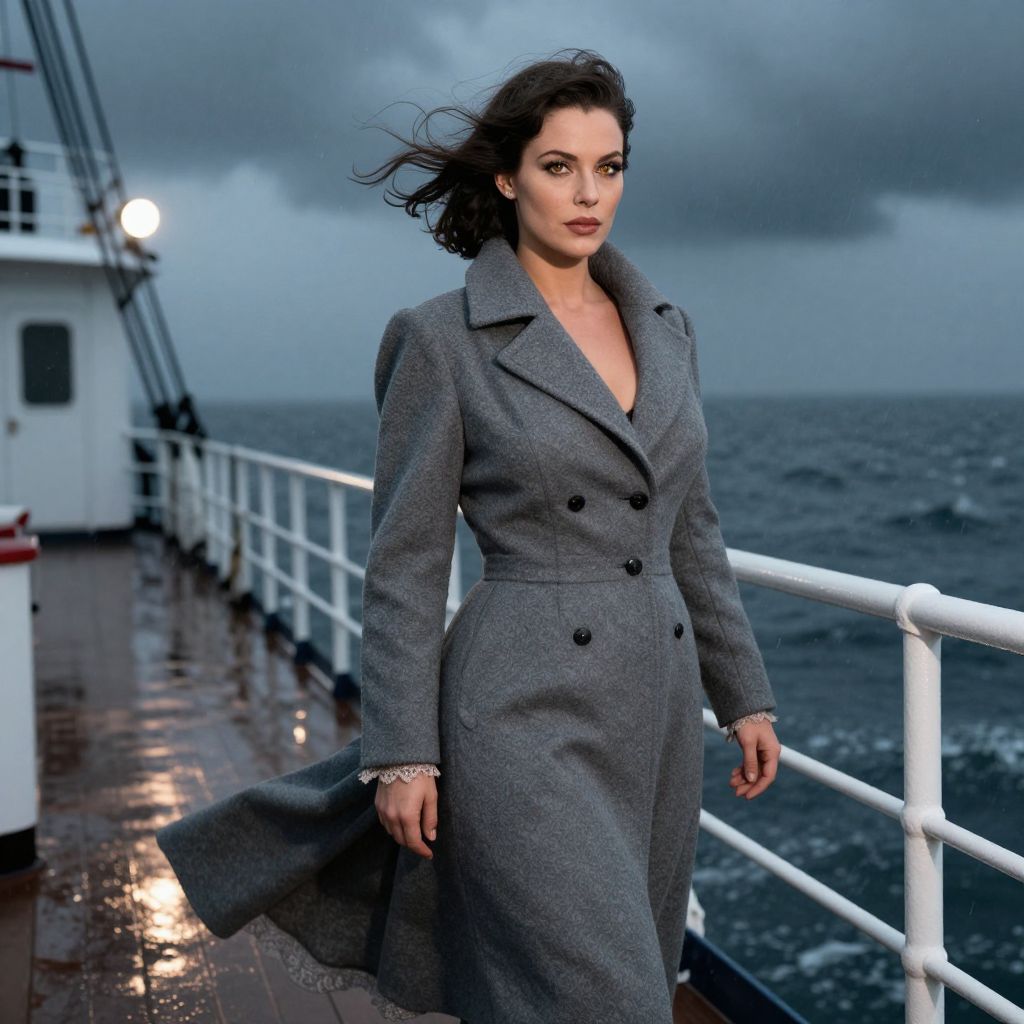 Photograph of a confident woman with pale skin and dark, wavy hair standing on a wet, metal deck of a ship during a stormy sea voyage. She wears a grey, double-breasted, woolen coat with black buttons and a silver bracelet on her right wrist. The background features a stormy, overcast sky with dark clouds, and a white ship railing to her right. The deck is shiny from rain, and there's a white ship structure to her left. Her expression is determined, and the wind blows her hair to the right. The image has a slightly dramatic, cinematic quality.