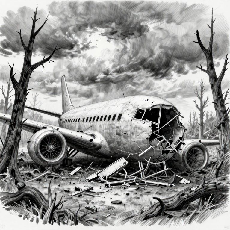 Crashed airplane drawing in a dramatic landscape, detailed sketch with twisted metal and scattered debris, surrounded by charred trees under a stormy sky, monochrome pencil art with high contrast shadows and intricate linework.