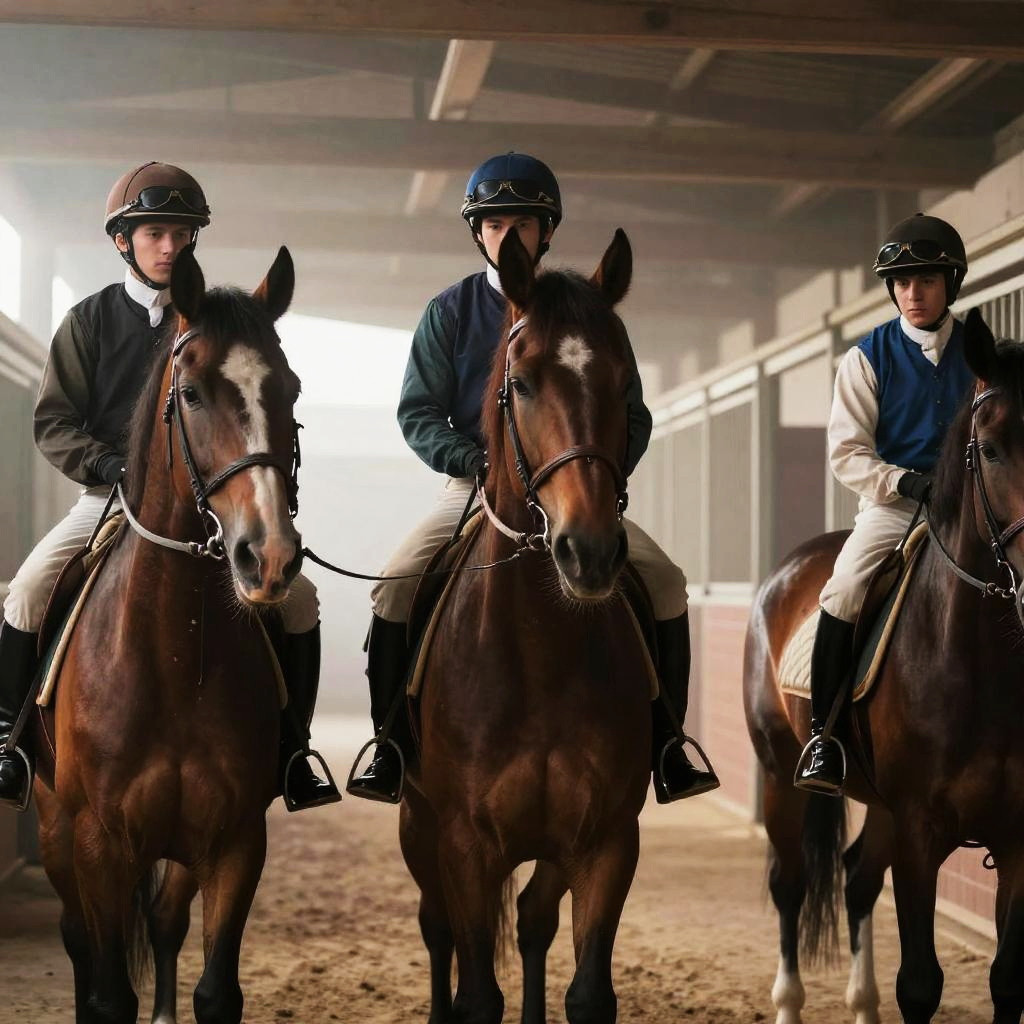 Jockeys preparing their horses in a misty early morning stable, soft diffused light through wooden beams, horses with rich textures and intricate tack, quiet intensity and focus on jockeys' faces, cinematic portrait style