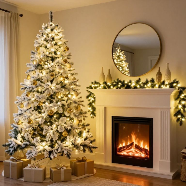 Cozy living room warmly illuminated by a glowing fireplace, featuring a tall white Christmas tree adorned with gold ornaments and sparkling lights, positioned to the left of a large circular mirror above the mantel, which is decorated with twinkling garlands and three vases, while three gift boxes rest neatly beneath the tree.