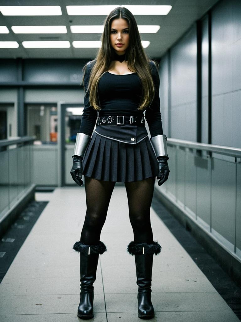 Photograph of a young woman standing in a brightly lit, grey-toned hallway with fluorescent lights. She has long, straight brown hair and wears a black long-sleeve top, short black pleated skirt, black stockings, and black boots with fur accents. She also wears silver metal cuffs on her wrists and a black belt with a large buckle. Her black leather gloves add a touch of edginess. The hallway has grey walls and a tiled floor, with a door and some indistinct objects in the background. The overall style is gothic or punk with a modern twist.