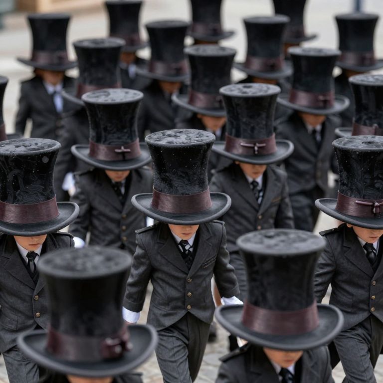 An army of whispering top hats marches in formation, each brim concealing a miniature universe inhabited by tiny philosophers.