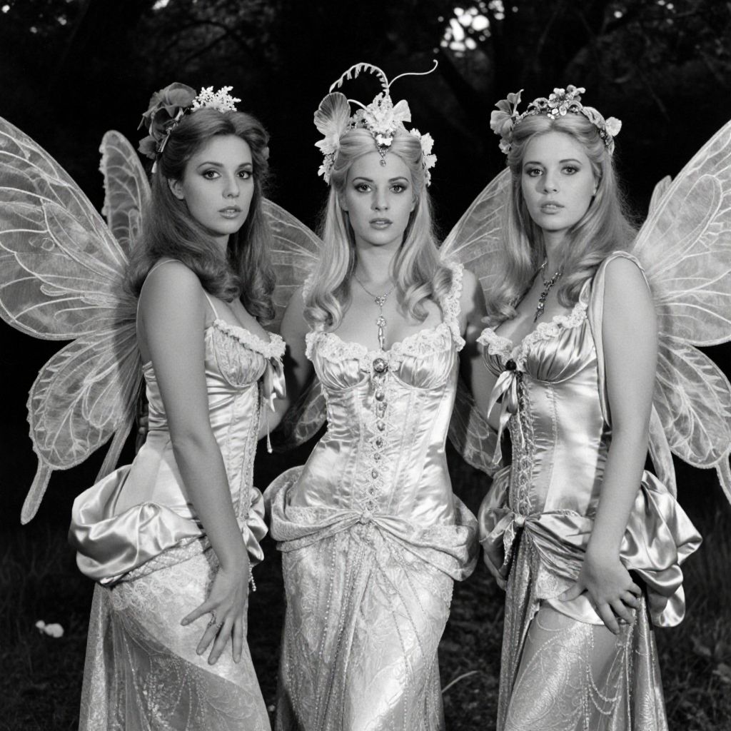In this striking black-and-white image, three women dressed as dramatic garden nymphs stand in a symmetrical pose, their faces turned slightly away from the camera, creating a sense of mystery and intrigue. Each woman is adorned with intricate, vintage-inspired costumes featuring silk and laces, with elaborate headpieces and wings that add to their ethereal appearance. The background is a lush, dark garden, providing a stark contrast to the detailed textures of their attire. The overall composition is balanced and harmonious, with the women positioned in a way that draws the viewer's eye across the frame. The image exudes a sense of performative poses and dynamic faces, evoking a sense of lost, intricate detail, and hyper-realistic beauty. The film grain and heavy grainy texture add to the retro, 1975 fashion aesthetic, reminiscent of Jodorowsky movies and the Holga camera style. The medium format 120 film and 35mm cinemascope with technicolor enhance the cinematic quality of the scene, capturing the essence of a movie scene where these nymphs might be dancing with the moonlit knight at the end of the road.