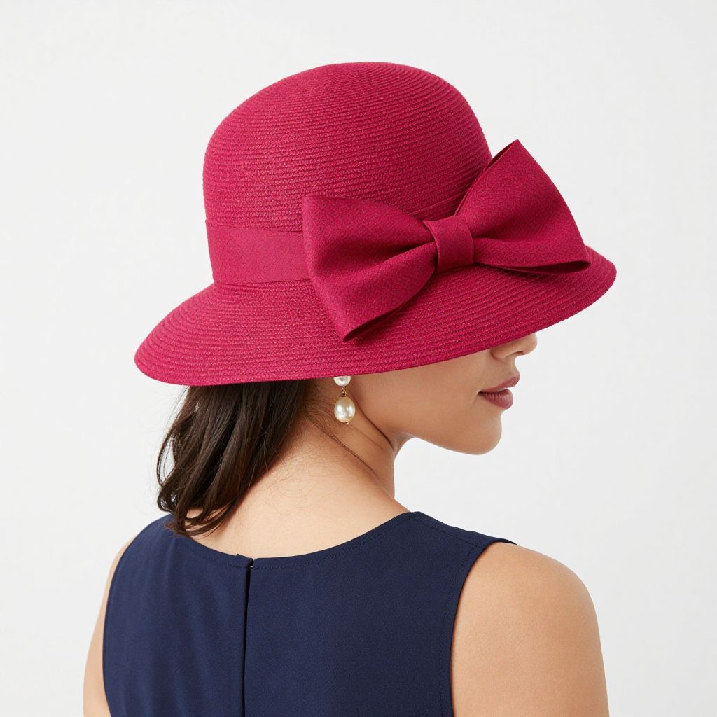 Woman wearing a raspberry red sinamay hat adorned with a large silk abaca bow, complemented by a navy blue sleeveless top and pearl earrings, set against a clean white background.