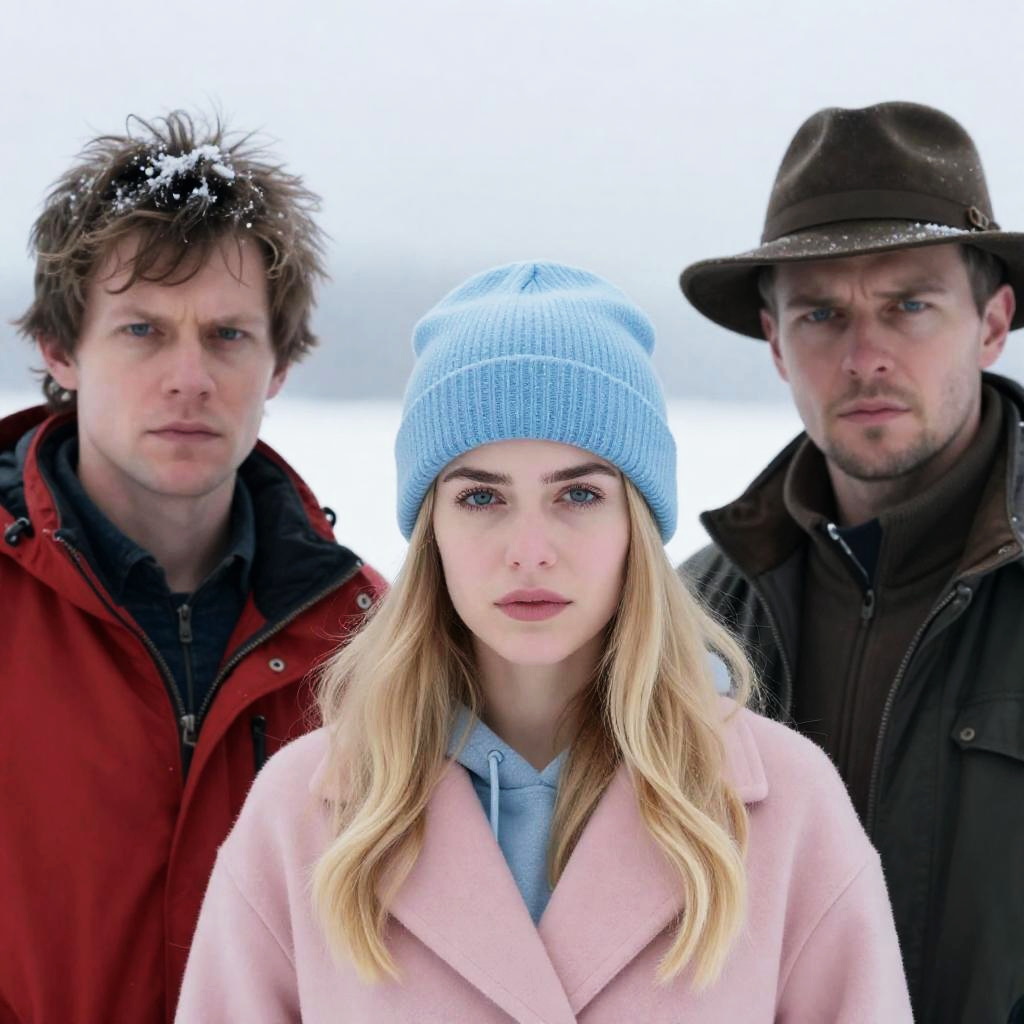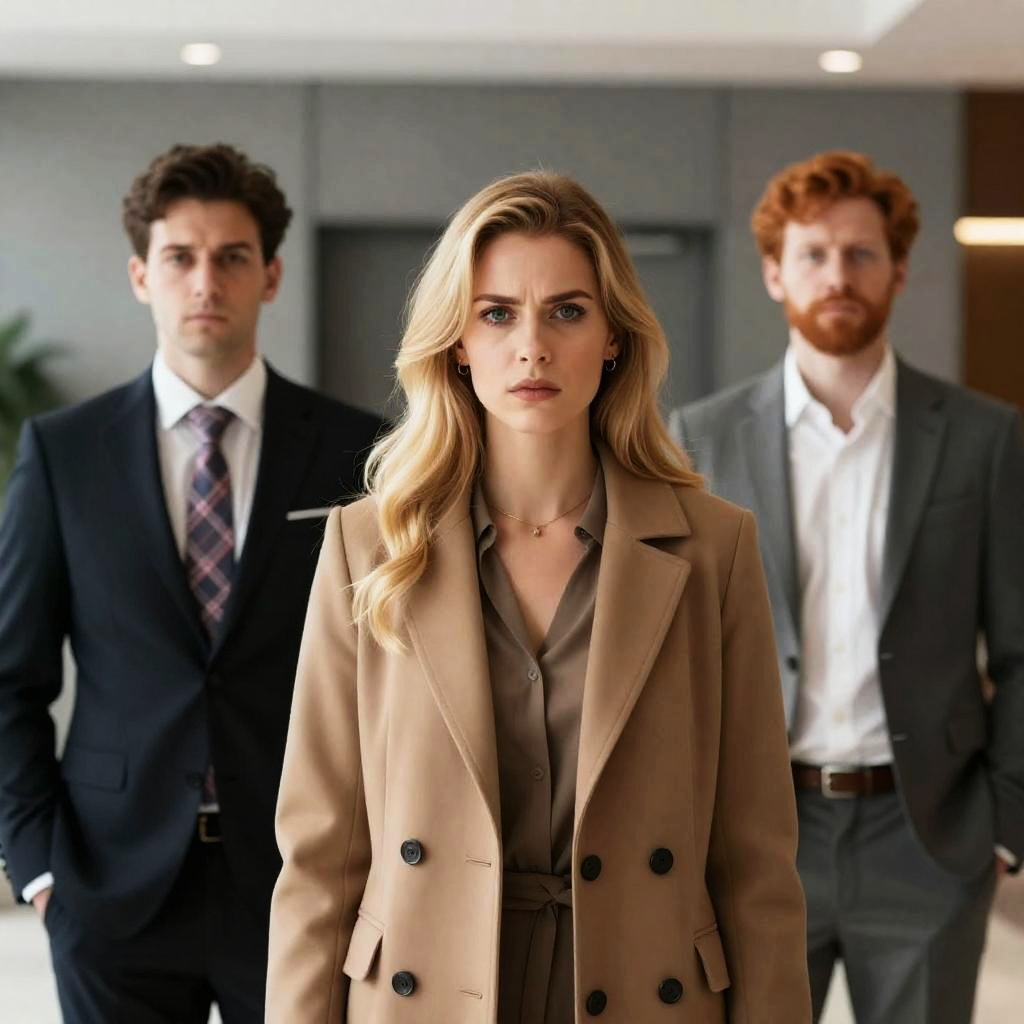 Photograph of three people walking down a brightly lit hallway. Blonde woman in gray coat and beige scarf center, intense expression. Young man in green jacket and red beanie left, neutral expression. Brown-haired woman in yellow coat and black top right, neutral expression. White tiled floor, white walls, large window in background.