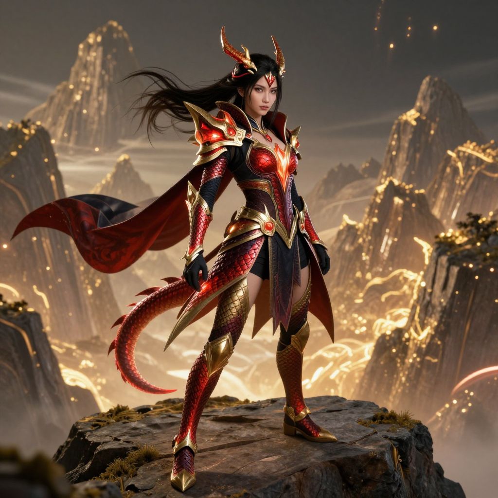 A fantasy girl in a richly detailed dragon-scaled costume with glowing red and gold accents, standing on a rocky cliff overlooking a glowing mountain range; she has dark eyes, sharp cheekbones, and a determined expression, dressed in a dynamic fantasy outfit with tail-like sleeves and a cape that flares in the wind.