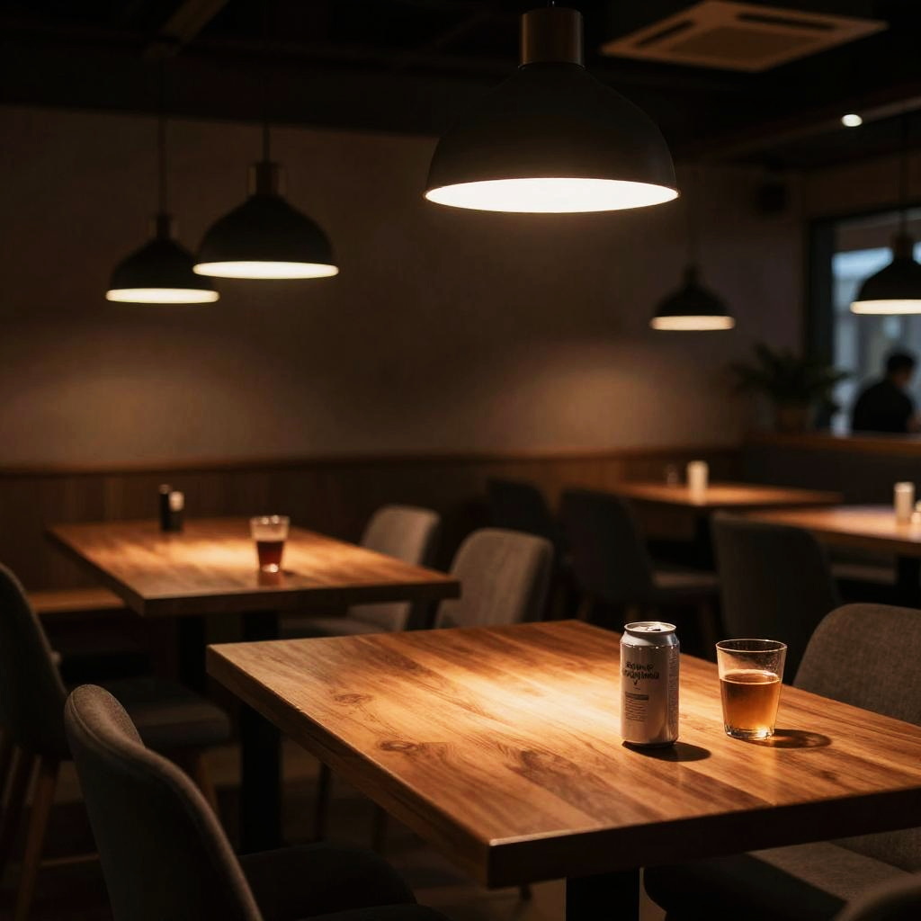 No humans, table, indoors, chair, scenery, ceiling light, restaurant, lamp, cup, couch, alcohol, shadow, wooden table, can, light