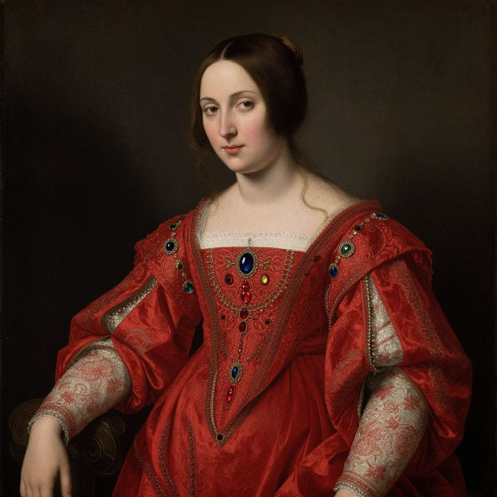 A classical oil painting reminiscent of Renaissance portraiture, featuring a woman adorned in a richly detailed red dress with intricate lace and jewel embellishments, set against a dark, textured background that highlights her elegant attire and poised demeanor.