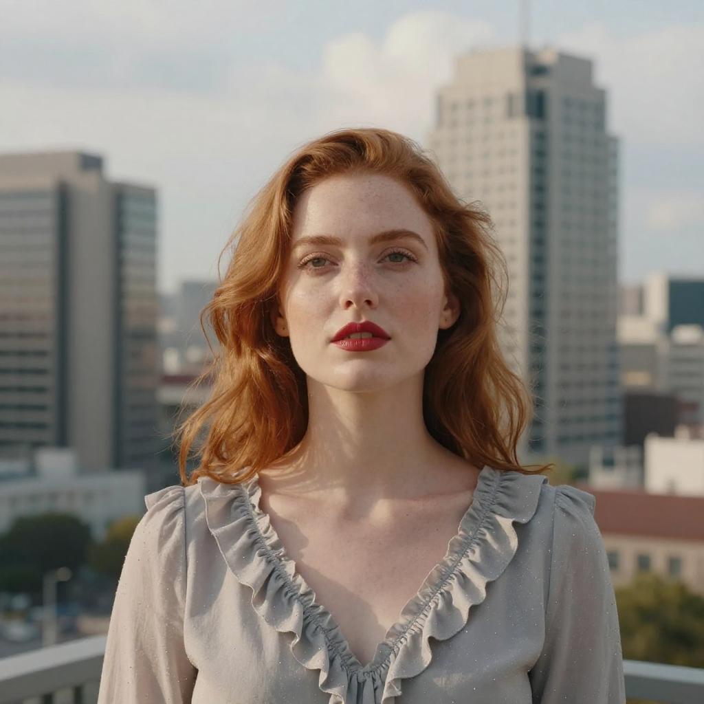 Photograph of a red-haired woman with fair skin and red lipstick, standing in front of a blurred cityscape of tall, modern buildings. She's wearing a light gray, ruffled blouse with subtle sparkle details. Her expression is calm and slightly upward, giving a sense of contemplation or hope. The sky is partly cloudy, and the buildings are out of focus, emphasizing her presence.
