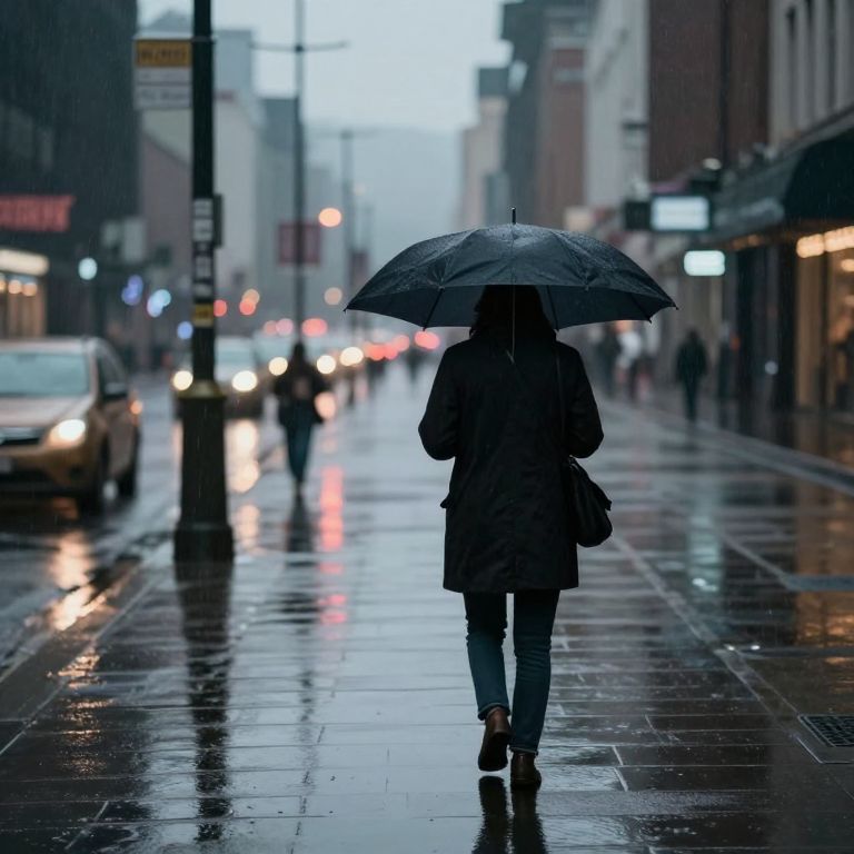 Photograph of a person in a dark coat and umbrella walking on a wet, rainy city street at dusk, with blurred car lights and buildings in the
