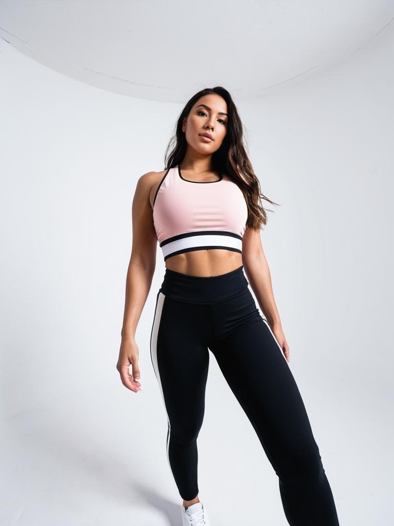 Woman, athletic streetwear, black crop top with a v-neckline, sleeveless, matching high-waisted leggings with a streamlined silhouette, white low-top sneakers, studio background --sref 1447