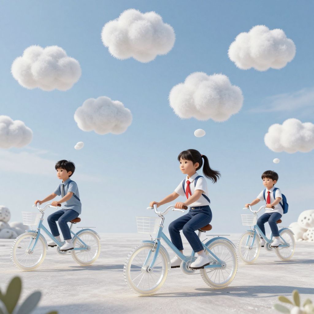 Digital illustration of three Asian children in school uniforms riding white bicycles on a bright, cloud-filled blue sky background.