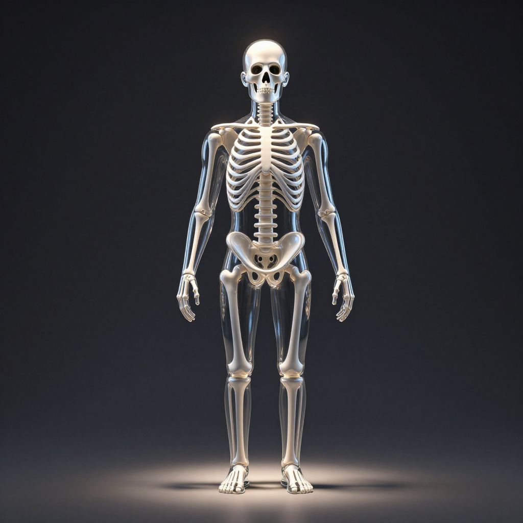 Of glass tube system in the shape of a human skeleton in the style of an anatomy model, glossy highlights, unreal engine, 8k, spotlights, smooth ambient light, effect light, darkgray background