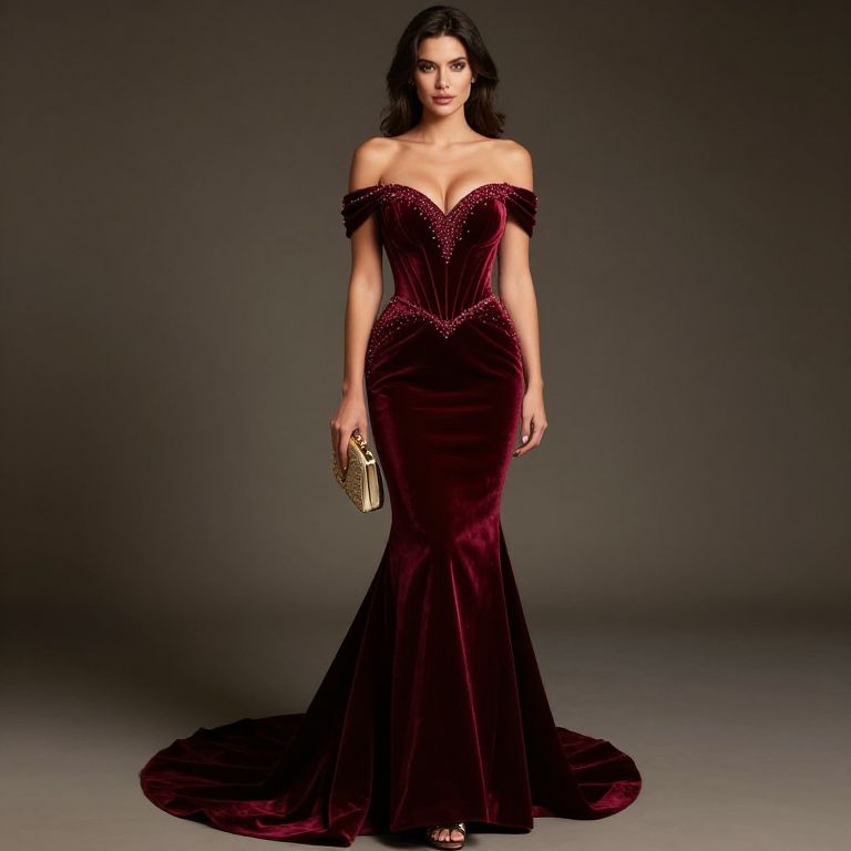 "Sophisticated plunging neckline, mermaid-style dress, rich burgundy velvet, intricate beaded embellishments, off-the-shoulder sleeves, dramatic train, corset back, gold accents, vintage-inspired clutch, strappy metallic heels.. Sexy. Pretty face and beаutiful eyes. Big breasts."