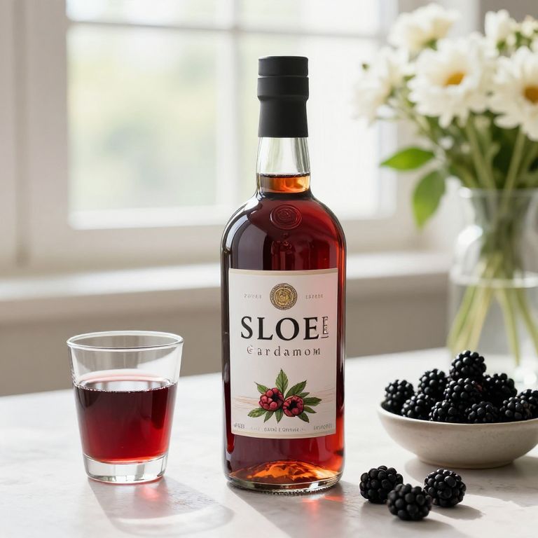 Sloe and Cardamom Liqueur bottle sits prominently on a table, accompanied by a glass filled with its deep red liquid, a bowl brimming with fresh blackberries, and a vase of white flowers in the background, all bathed in natural light streaming through a window.