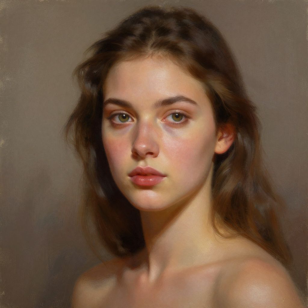 This is a digital painting of a young woman with fair skin, green eyes, and long, wavy brown hair. She has a slender neck and is depicted from the shoulders up against a muted, grayish-brown background. Her expression is neutral, with slightly parted lips and soft, natural makeup. The artist has used realistic brushstrokes to highlight her delicate features and the subtle textures of her skin and hair. She appears to be topless, with no visible clothing. The lighting is soft, casting gentle shadows that add depth to her face. The overall style is realistic with a slightly romantic, painterly touch.