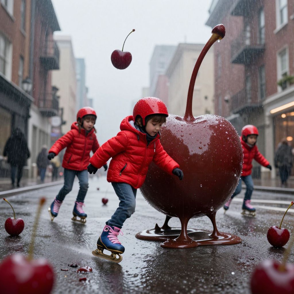 In a whimsical, surreal digital art rendering, children dressed in vibrant red puffer jackets skate through a fantastical urban street transformed into a giant maraschino cherry jar, where molten chocolate skates glide over a rainstorm of frozen cherries, creating a dreamlike, high-definition blend of fantasy and reality.