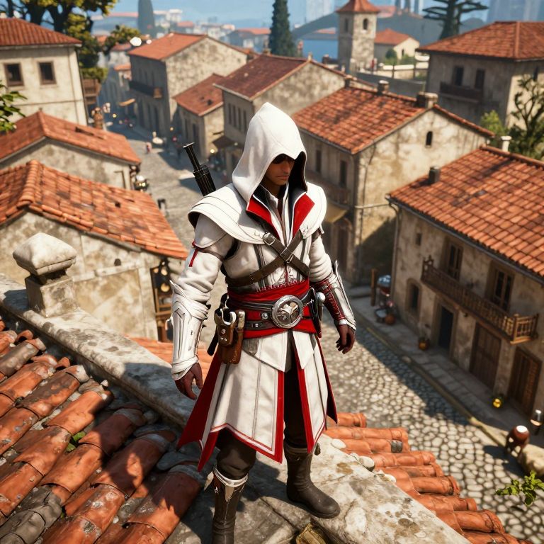 A high-definition 3D-rendered scene from \"Assassin's Creed Rogue\" showcases a character clad in a white hooded outfit with red accents, standing atop a rooftop overlooking a sunlit Mediterranean-style town with terracotta roofs and cobblestone streets, capturing the game's immersive historical fantasy aesthetic.