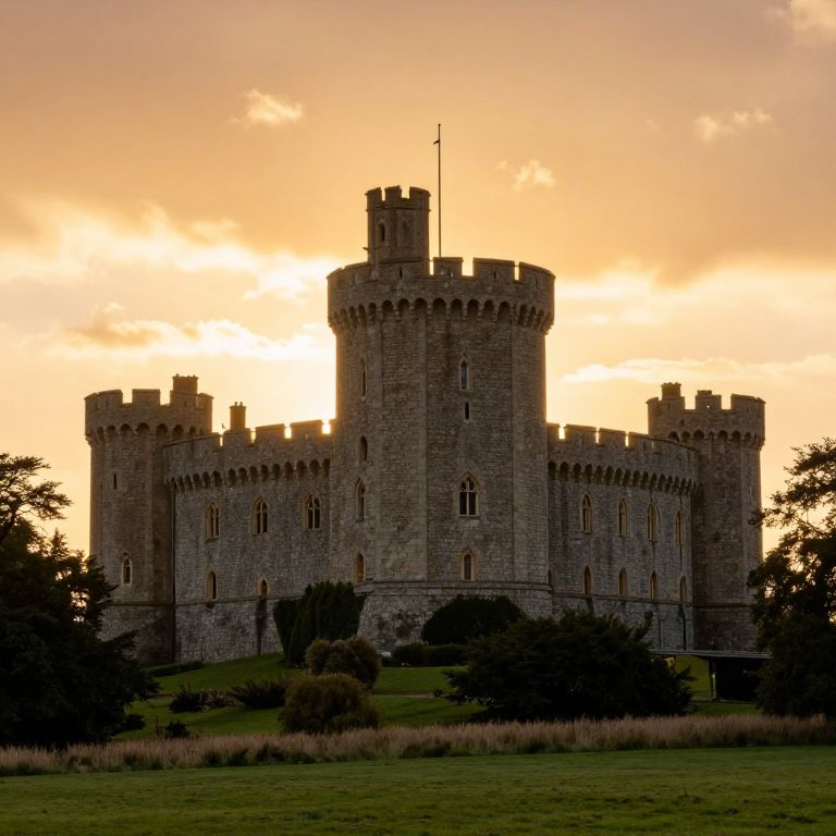 Photograph of a medieval stone castle at sunset. The castle features a central cylindrical tower with crenellations and a flagpole. The sun is setting behind the castle, casting a golden-orange glow across the sky and illuminating the stone structure. The castle's walls are textured with large, grey stones. In the foreground, there's a grassy lawn with patches of taller grass and some dark, silhouetted trees framing the castle. The overall composition highlights the castle's robust and historical architecture against a vibrant, warm sky. The scene exudes a sense of timeless grandeur and tranquility.