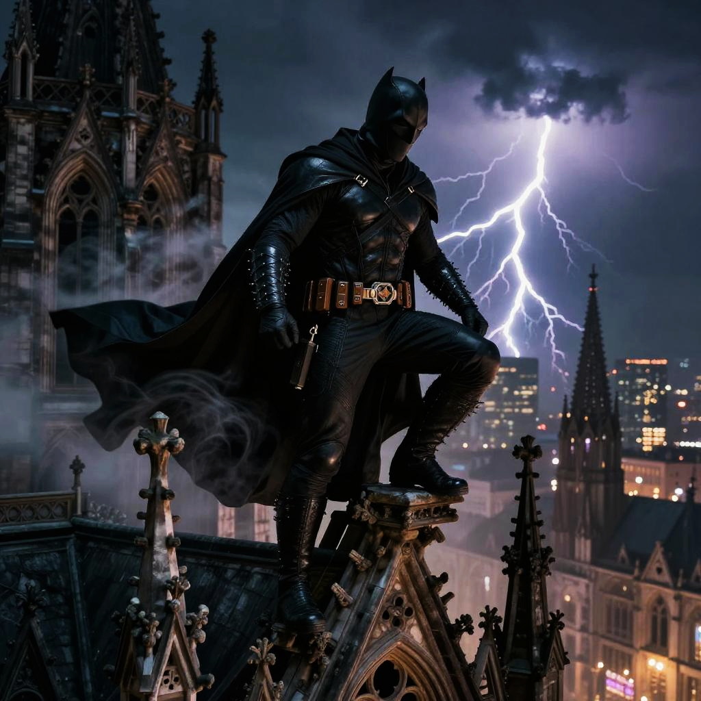 Epic dark marvel image of a vigilante cloaked in black, perched on a gothic cathedral spire at night, swirling mist and distant thunderstorm, intricate textures on costume and background, bold contrast between shadow and dim neon lights, comic book realism.
