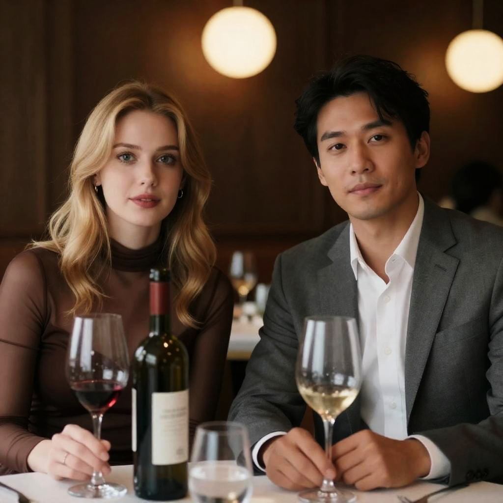 Photograph of a man and woman sitting at a table in a dimly lit restaurant. Woman with blonde hair, wearing a sheer brown top, holds a wine glass and bottle. Man with dark hair, in a gray suit and white shirt, holds a wine glass. Both have neutral expressions. Background includes blurred circular lights and wooden paneling. Multiple wine glasses on the table.