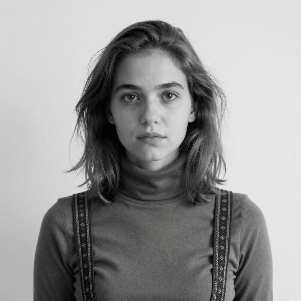 Black-and-white photograph of a young woman with wavy, shoulder-length hair, wearing a sleeveless, patterned top. She rests her chin on her hand, gazing intently forward. Her left wrist has a thin, circular watch. The background is blurred, focusing attention on her. The image has a moody, introspective atmosphere.
