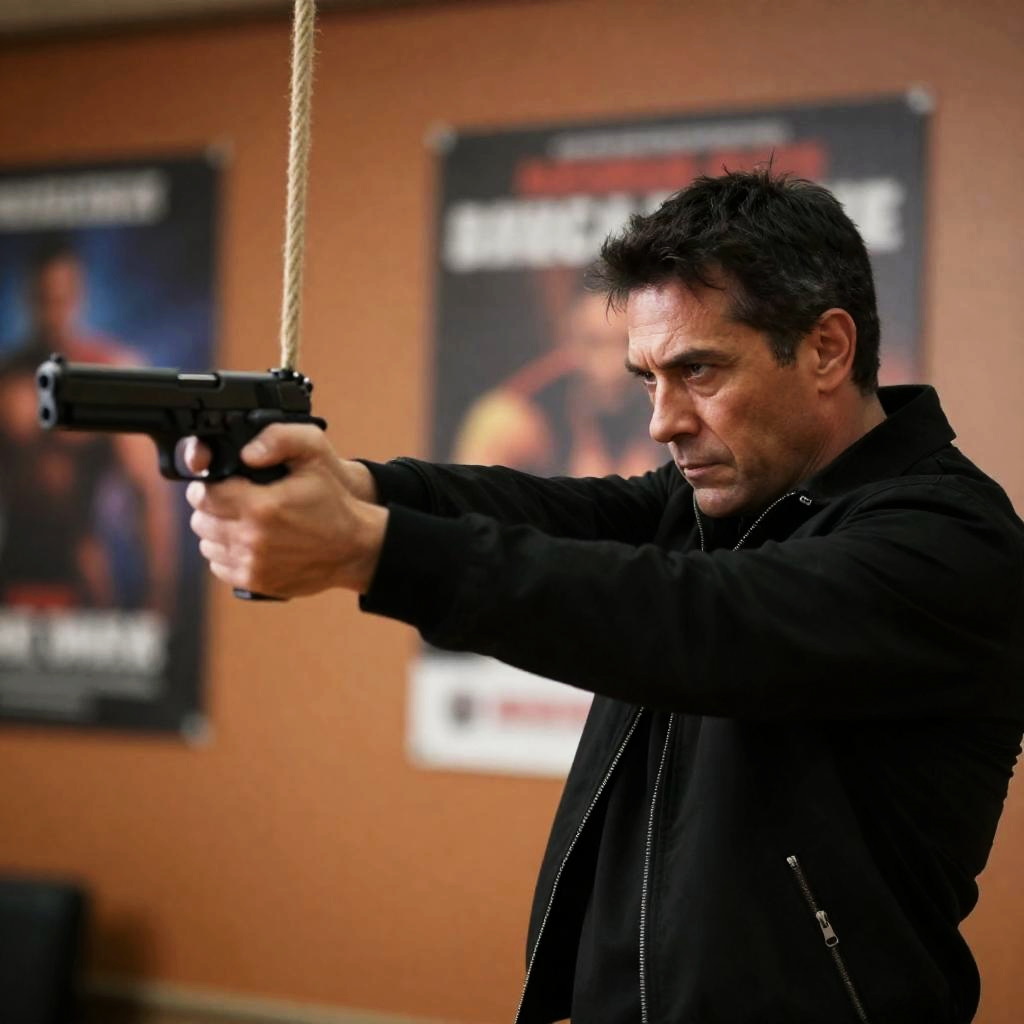 Photograph of a muscular man with short dark hair, wearing a gray sleeveless shirt and green cargo pants, holding a black gun. He stands beside a person lying on the ground, partially illuminated by green and yellow lights. The person on the ground is dressed in dark clothing with visible injuries and is reaching out. The background is dark, with indistinct objects and light sources. The man's expression is intense and focused.