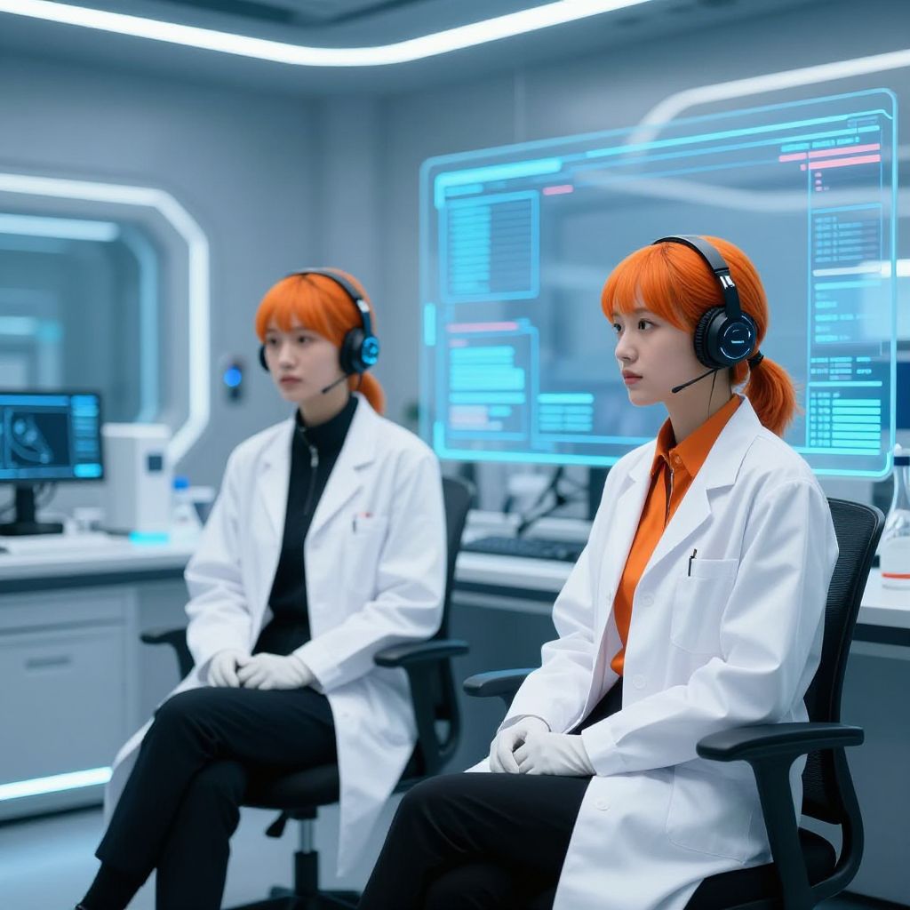 Two female scientists with orange hair and white lab coats seated in a futuristic laboratory. The room features advanced transparent digital screens displaying data and controls, with a sleek, modern design. Both characters wear black and orange attire underneath their lab coats, with technological accessories such as headsets and gloves, suggesting a focus on innovation and research.