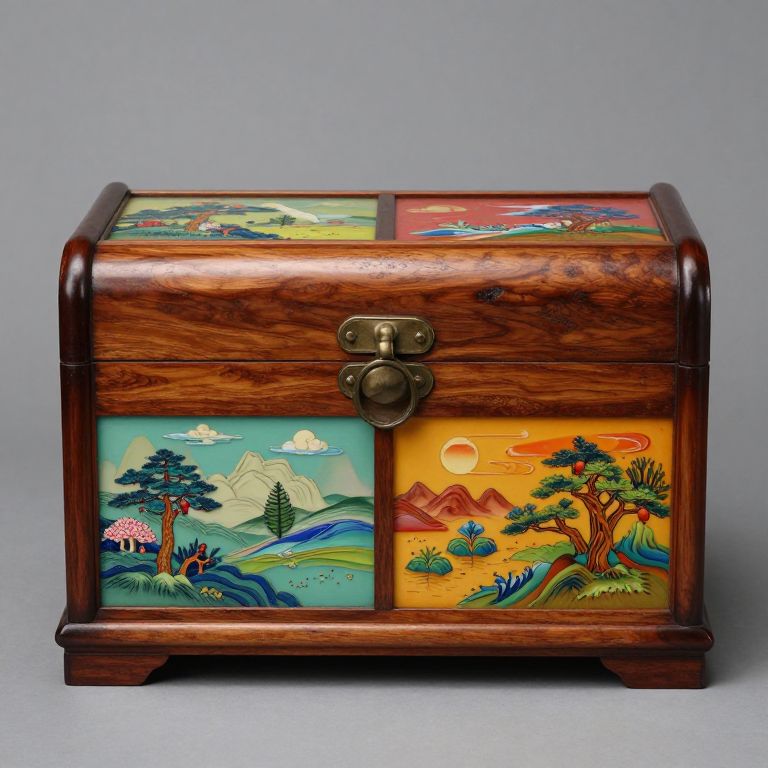 A serene wooden chest adorned with a vibrant four-seasons landscape motif invites reflection on the passage of time, embodying the wisdom that true fulfillment lies in embracing life’s ever-changing rhythms with joy and mindfulness.