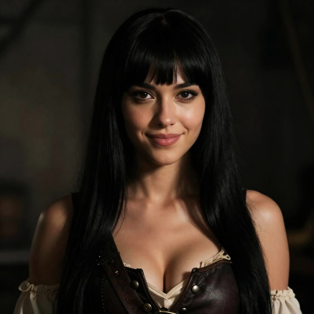 A photorealistic portrait of a young woman dressed as a pirate, featuring long black hair with blunt bangs, natural skin texture, and a confident smile. She is wearing a brown leather corset over a beige off-shoulder blouse. The image has cinematic down lighting and high detail in 8k resolution.