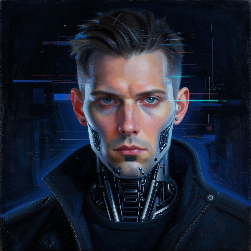 This digital portrait in a cyberpunk style features a young man with pale skin, blue eyes, and short, dark hair. His face is partially illuminated with glowing blue lines and circuitry patterns, giving a futuristic, robotic appearance. He wears a dark jacket over a high-collar shirt, which is also adorned with similar blue circuitry designs. The background is dark and abstract, with faint blue and white lines adding to the technological theme. The man's expression is serious and focused, enhancing the high-tech, sci-fi atmosphere of the image.
