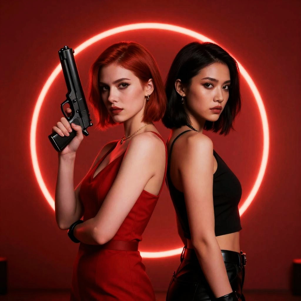 Two women in yellow bikinis and white masks, standing side by side, pointing guns forward. Blue and purple neon lights create a dim, nightclub-like atmosphere. Both women have toned physiques. The background has a glass door with a handle.