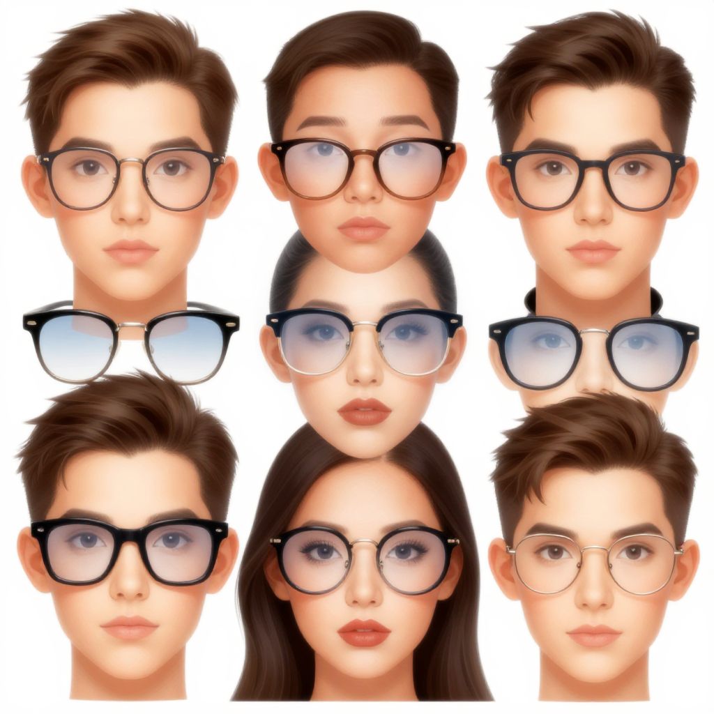What glasses suit my face: an artistic collage of multiple face shapes layered with trendy and classic eyewear designs, showcasing the best glass frames per face contour, elegant patterns, clean lines, subtle gradients, high-detail digital art