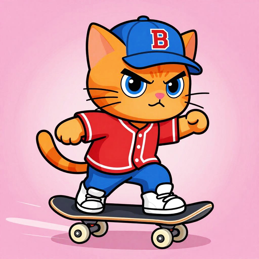 A colorful, cartoon-style drawing of an orange cat with blue eyes, wearing a red baseball shirt, blue cap with a red "B," and white sneakers, riding a skateboard. The cat has a determined expression and is mid-action, with a dynamic, swirling pink background adding energy to the scene. The art style is vibrant and playful.