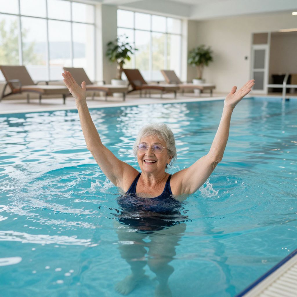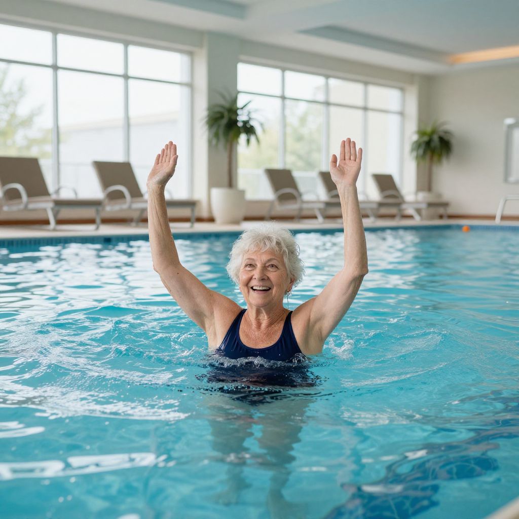 Senior woman enjoying water aerobics in a serene indoor pool, surrounded by large windows and lounge chairs, exuding joy and vitality.