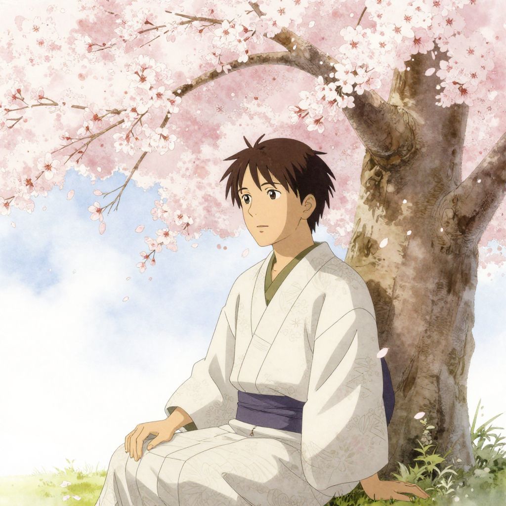 Anime-style digital illustration of a person with black hair in a white kimono, sitting by a serene, blue pond under pink cherry blossoms.