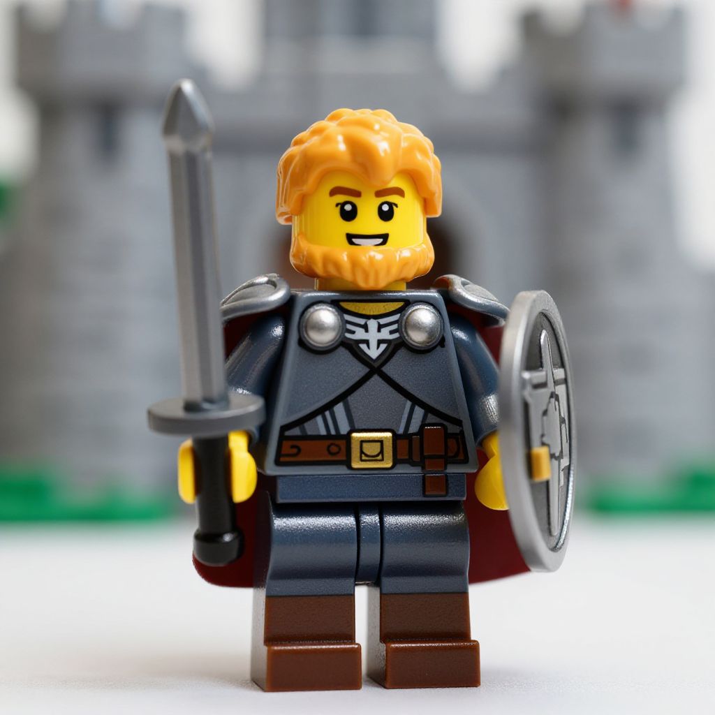 Lego man with beard wearing a medieval knight armor, holding a sword and shield, castle background, detailed beard texture, soft shadows, realistic plastic look
