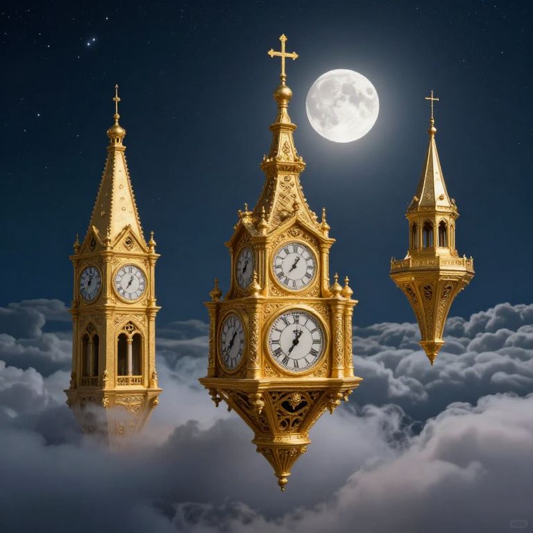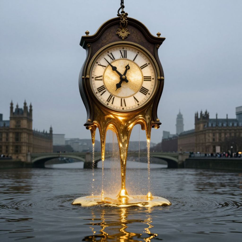 A colossal, melting grandfather clock hangs suspended above a serene river, its golden hands dripping molten light that cascades like liquid gold onto the water below, creating a mesmerizing blend of analog elegance and surreal wonder.